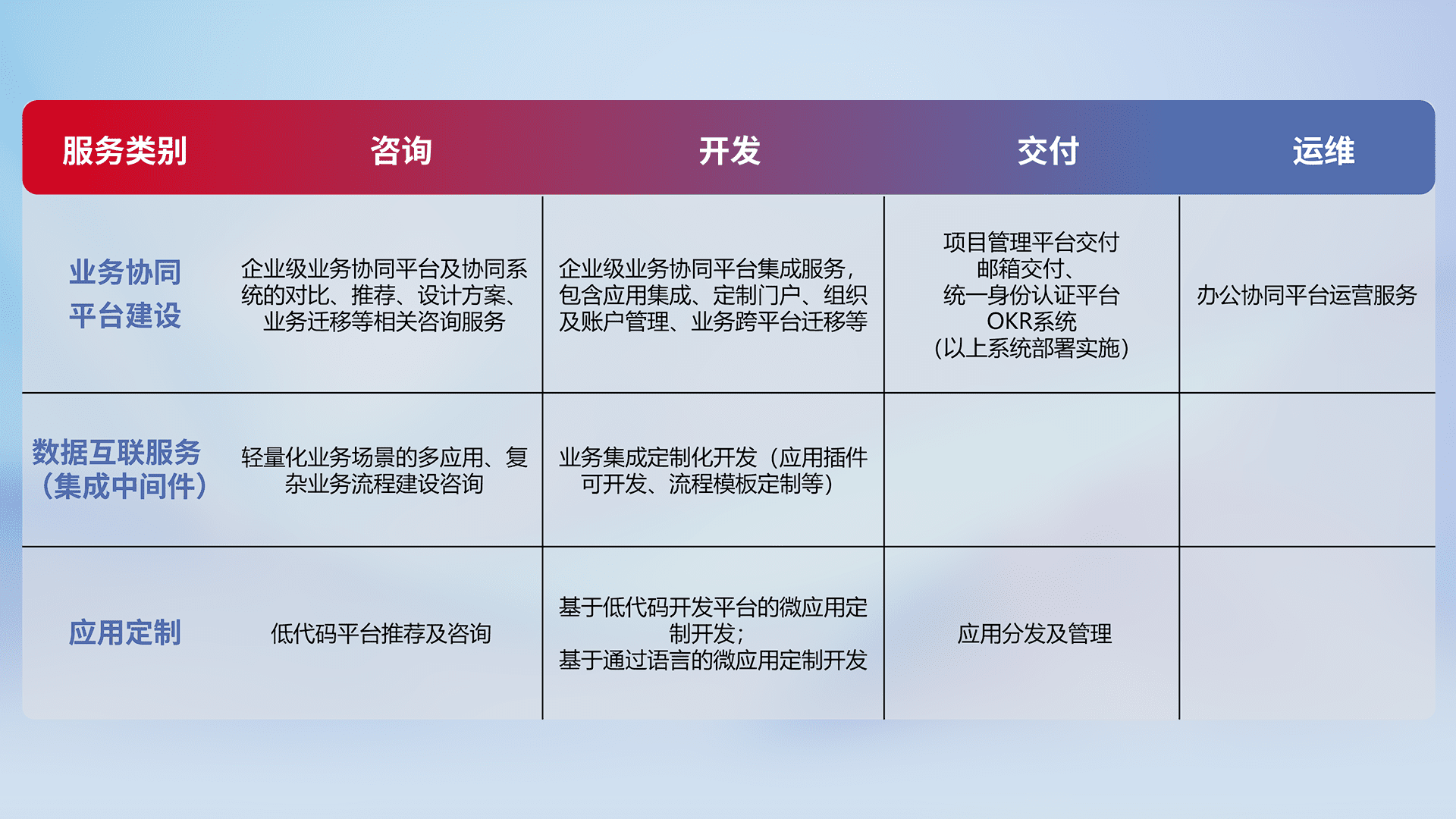 针对钉钉、、企微、、IDaas等平台级产品提供产品的规划、、方案、、、、交付、、、、定制化开发等服务,,,实现如统一协同办公、、、、智能客户服务、、、、混合会议管理、、、智能数据查询、、等业务场景,,,,实现数字化转型。。